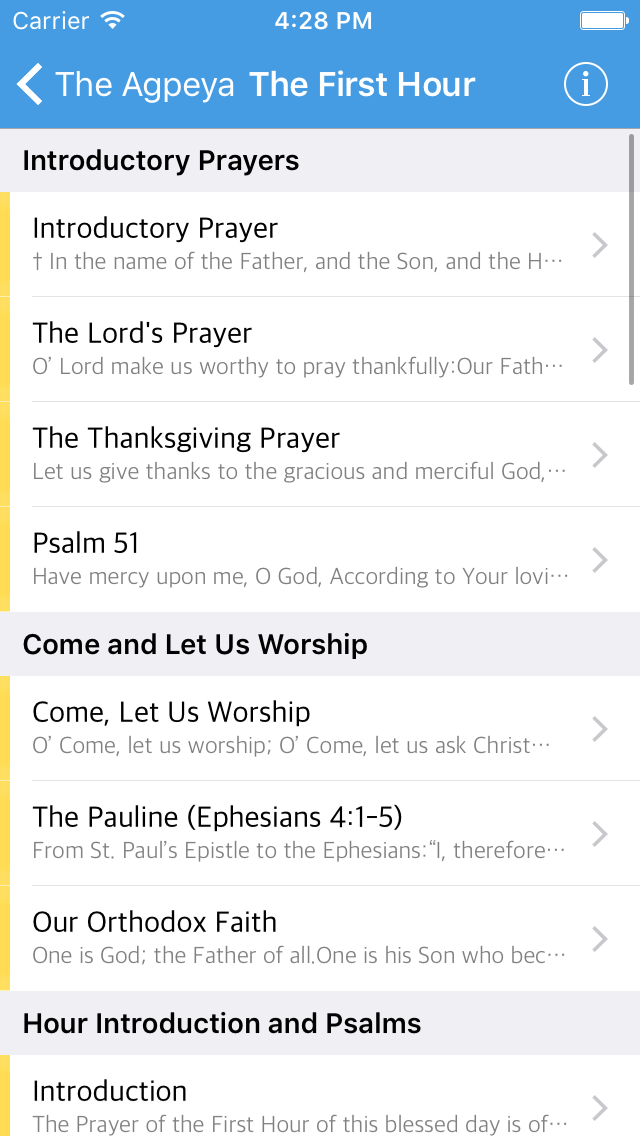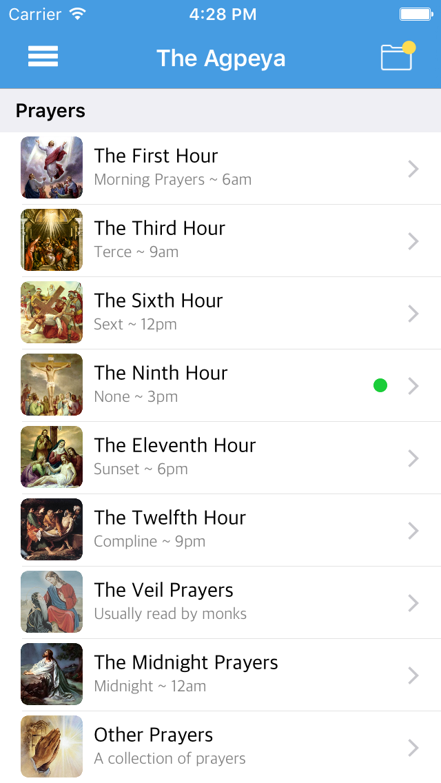 The Coptic Orthodox Agpeya (Agpia), is a prayer book, "the book of hours". It contains prayers for 7 different hours to be said out throughout the day. The hours are chronologically laid out in a neat way, each containing a theme corresponding to events in the life of our Lord Jesus Christ.