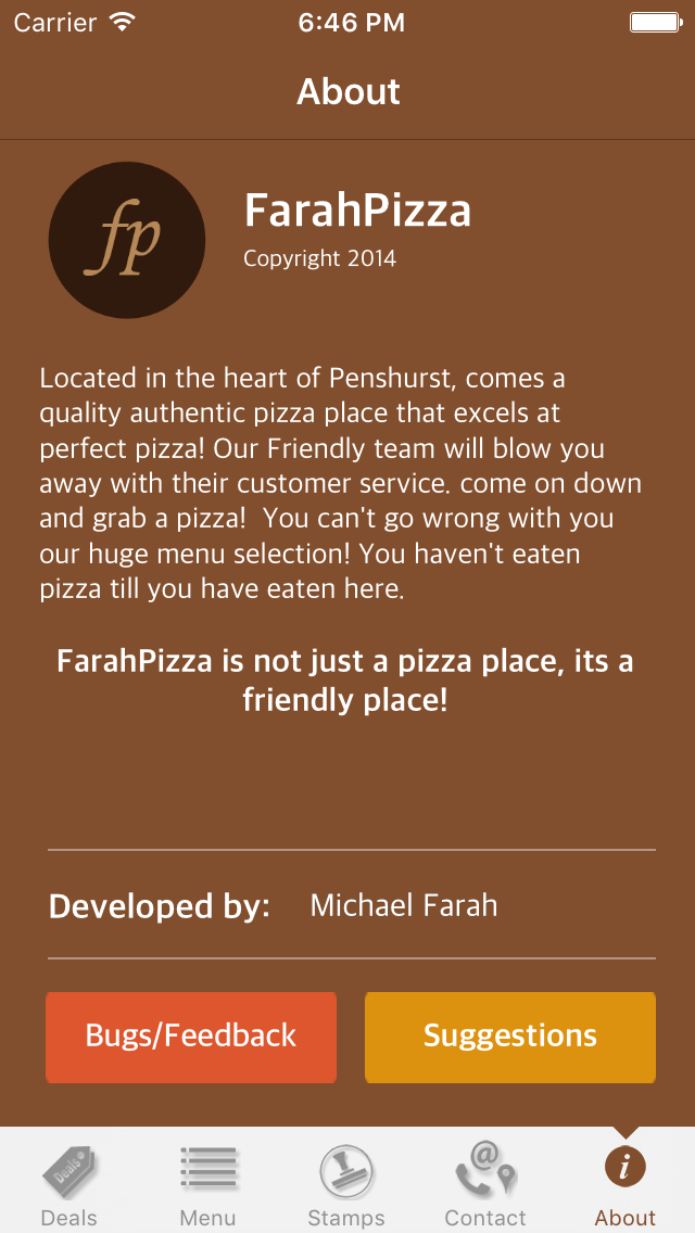 FarahPizza is a fully working demo application of an electronic loyalty card program to be used by customers of a restaurant. If you would like something similar to this app for your business, please contact us.